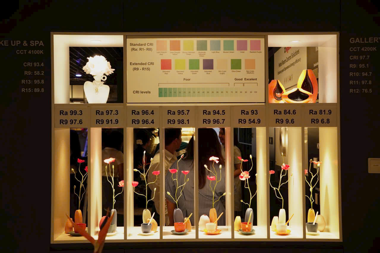 ➤ High-fidelity lighting experiences: CRI, CCT, R9/R15—showing how lighting alters mood, color, and material perception.