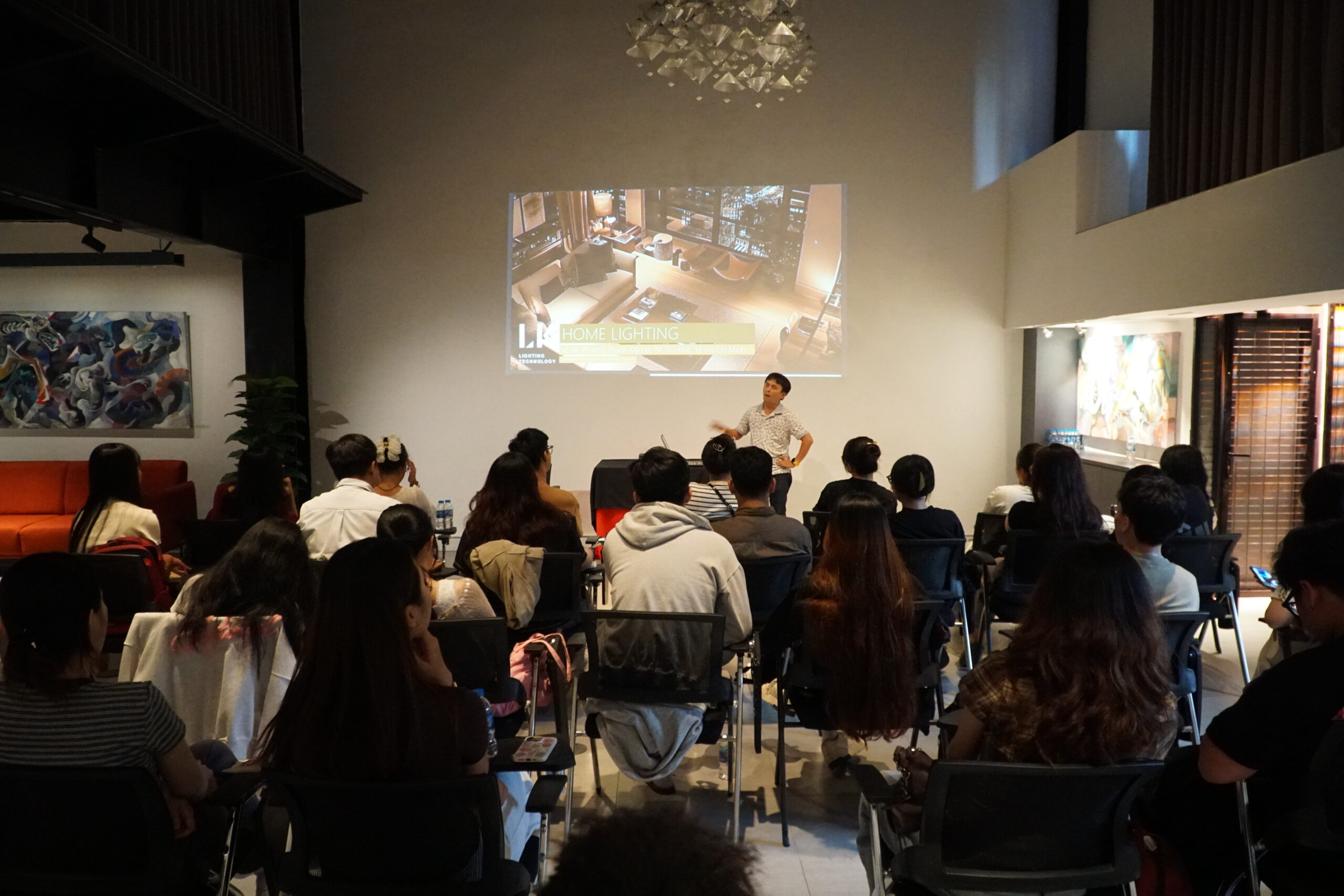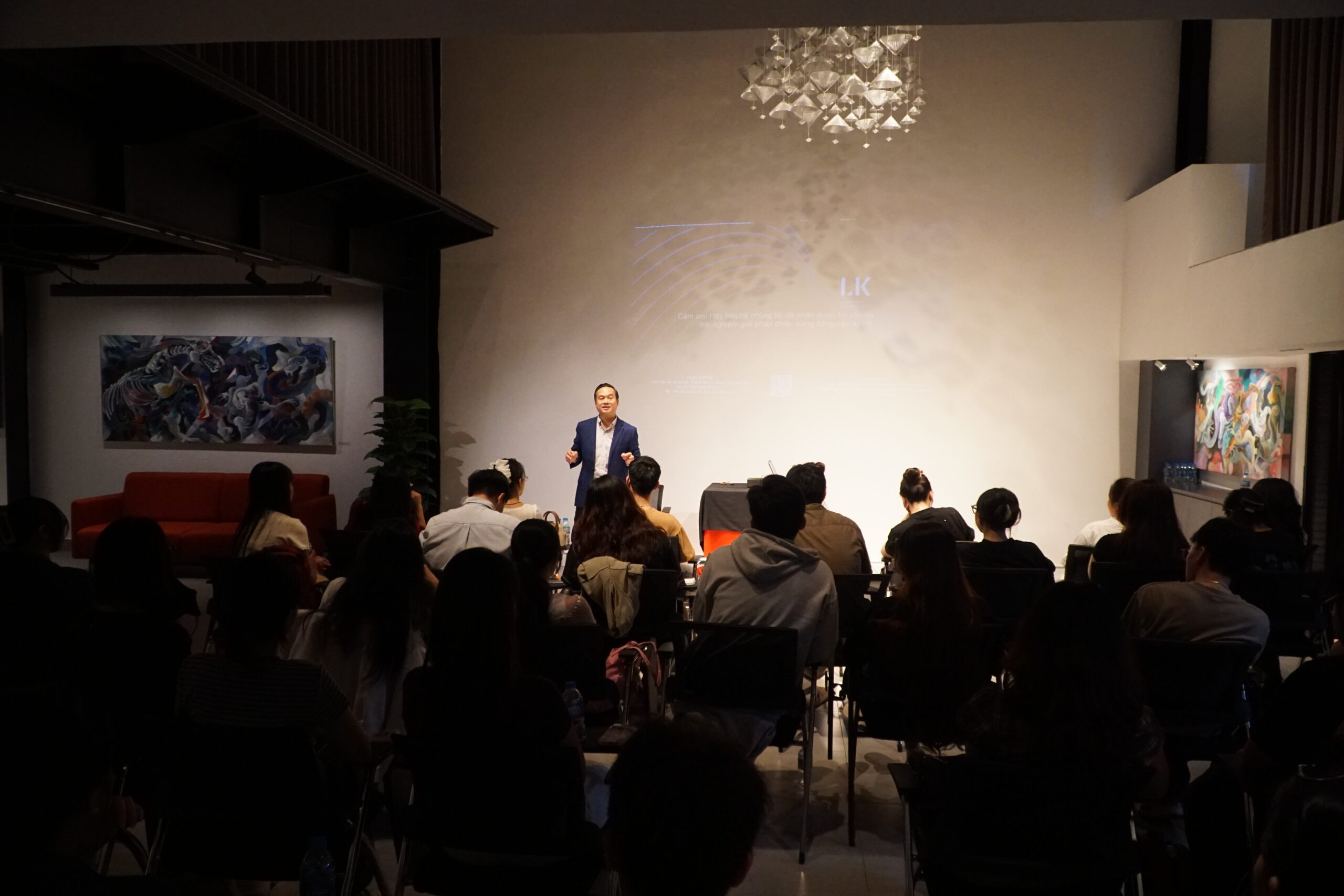 Following the tour, the students gathered in the LightHub Ballroom for a Presentation & Q&A Session hosted by LK Technology. Mr. Nguyen Manh Hoang, CEO of LK Technology, opened the session with insights on career orientation in lighting design, emphasizing that light is not merely a technical element but a language of spatial emotion. He shared that interior designers hold a unique advantage when approaching lighting design, as they inherently understand how materials, color, and form interact to create emotional resonance within a space.